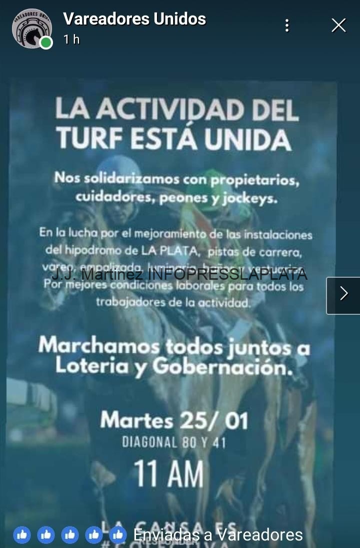 Ante un hecho sin precedentes en el Hipódromo de La Plata, dada la cantidad de afectados, al ser en forma grupal y por el reclamo que lo motivó: la Administración decidió sancionar a un grupo de jockeys por reclamar condiciones dignas y derechos para correr. Ante esta problemática el próximo Martes 25 de Enero movilizaran desde Diagonal 80 esquina 41 a las 11:00 horas hasta la Casa de Gobierno en calle 6 entre 51 y 53.