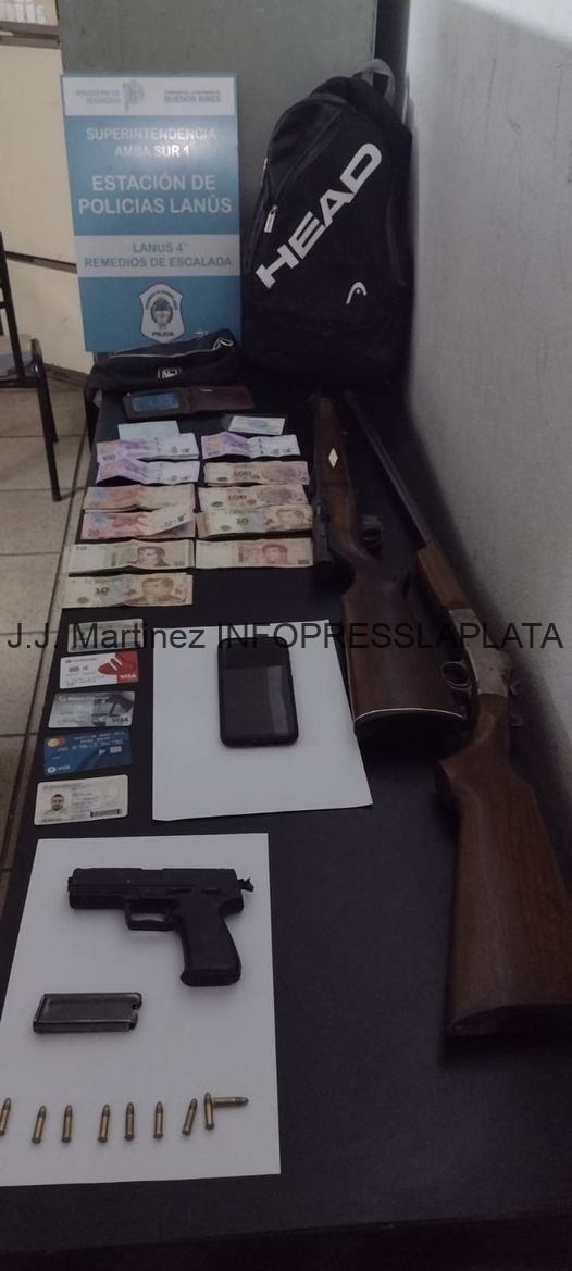 Efectivos de la comisaría Cuarta de Lanús con las imágenes de las cámaras aportada ven a dos ciudadanos con similares características. Al tratar de identificarlos los mismo se dan a la fuga realizando disparos a los policías. Los cuales repelen la agresión y siguen persecución a pie hasta dentro de una casa. Donde logran aprehender a dos sujetos los cuales tenían dos armas largas y una réplica resultando ser los autores materiales del hecho antes mencionado