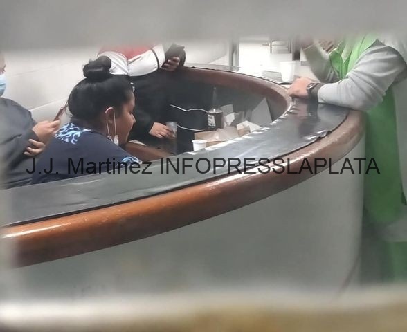 Y en un momento tome una foto, porque no podia creer lo que estaba viendo, como se ve en la imagen, estaban comiendo pizza y tomando cerveza (bebidas alcoholicas en horario de trabajo, esta de más aclarar que no corresponde). Tuve que ingresar por otro sector hasta encontrarla y poder saber cómo estaba.
