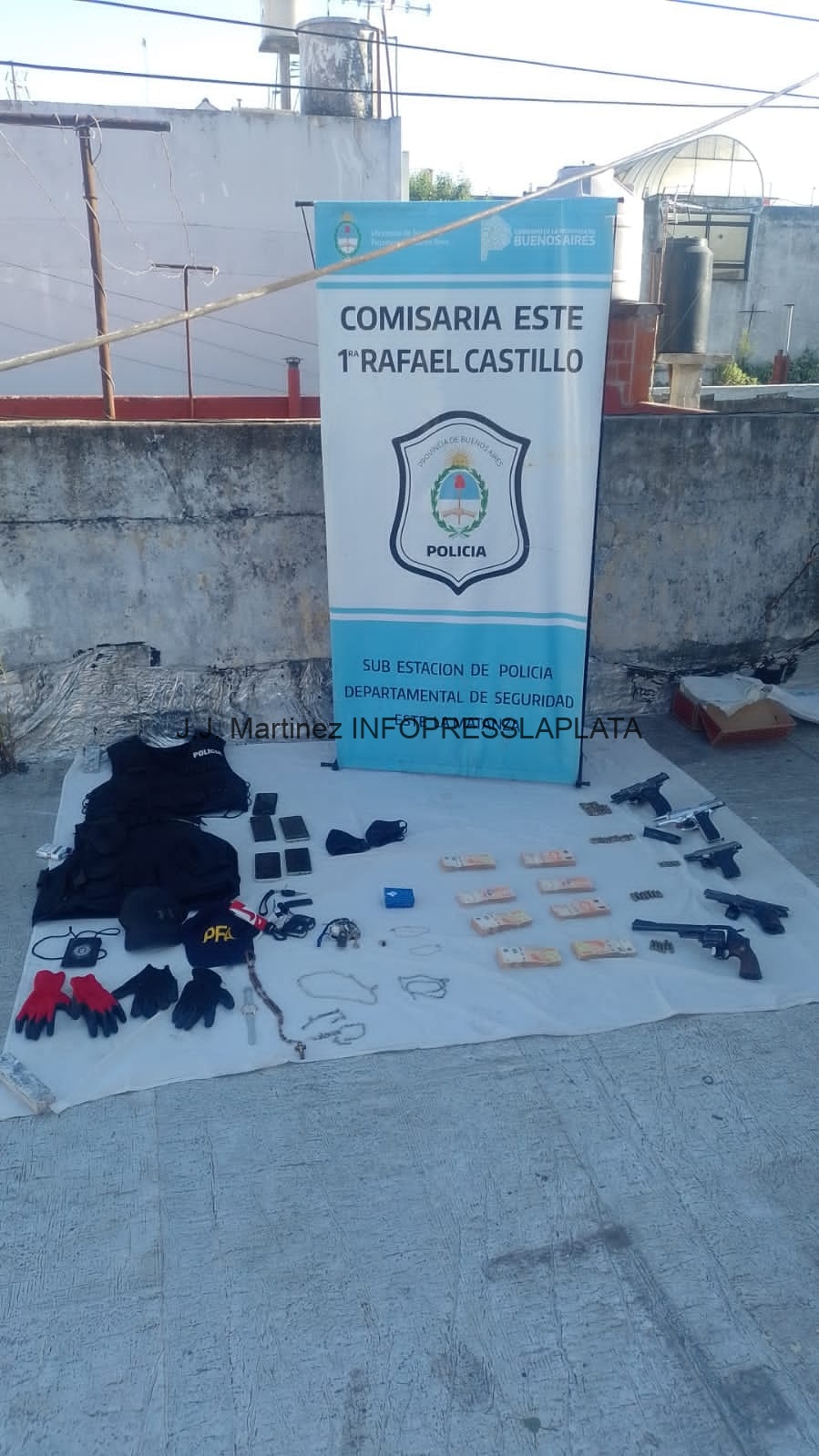 Personal de la Comisaría de Rafael Castillo se constituyo en una vivienda de la calle *San Matias 2782* a raíz de un “Robo en proceso” donde una vez próximo a la vivienda, alertado de la presencia policial tres masculinos se dan a la fuga del lugar, procediendo personal al ingreso y aprehensión de dos personas quienes se hallaban en el interior de la vivienda a quien se identifican al momento como: *Castro Juan (48) Dlio “Villa Albertina” – L de Zamora, Indocumentado* y de: *Insaurralde Julio Elias (57) Domiciliado en Lomas de Zamora Puede ser una imagen de 2 personas y texto que dice "BUENOSAIRES COMISARIA ESTE 1*RAFAEL CASTILLO POOWMLOADE SIENOTARG POLICIA SUB ESTACION DE POLICIA DEPARTAMENTAL DE SEGURIDAD ESTE LAMATANZA"Puede ser una imagen de 2 personas y texto que dice "BUENOSAIRES COMISARIA ESTE 1RAFAEL CASTILLO PREMCAOE PUENOSAG POLICIA SUB ESTACION DE POLICIA DEPARTAMENTAL DE SEGURIDAD ESTE LAMATANZA" Puede ser una imagen de 2 personas y texto que dice "BUENOS COMISARIA ESTE RAFAEL CASTILLO PROIMCAOR BUENOSARE POLICIA SUB ESTACION DE POLICIA DEPARTAMENTAL DE SEGURIDAD ESTE LAMATANZA" Ambos con vestimenta de Policia Federal Argentina, presentando además “chapa pecho” colocada, observando además cinco armas de fuego: 4 pistolas y 1 revolver y 2 chalecos antibalas, como asi en las inmediaciones del lugar, y tras una breve persecución en calle *Estanislao del Campo y Terrero* se logra la aprehensión de un tercero, identificado como: *Luis Esteban Junior Monterrosa Martinez (31) Domiciliado en Lanus, portando chaleco de policia, entrevistándose con: *Victima de (30) años quien da cuenta que los mismos arribaron a la vivienda refiriendo que se trata de un Allanamiento, efectuando un disparo en el interior de manera intimidatoria, victimas ilesas. En el lugar se procede además a la incautación de: *Vehículo VW UP Blanco Ptte AC-252-SZ en el cual arribaron al lugar. Interviene señor agente fiscal Dr Diomede, UFI 5 Dtal.