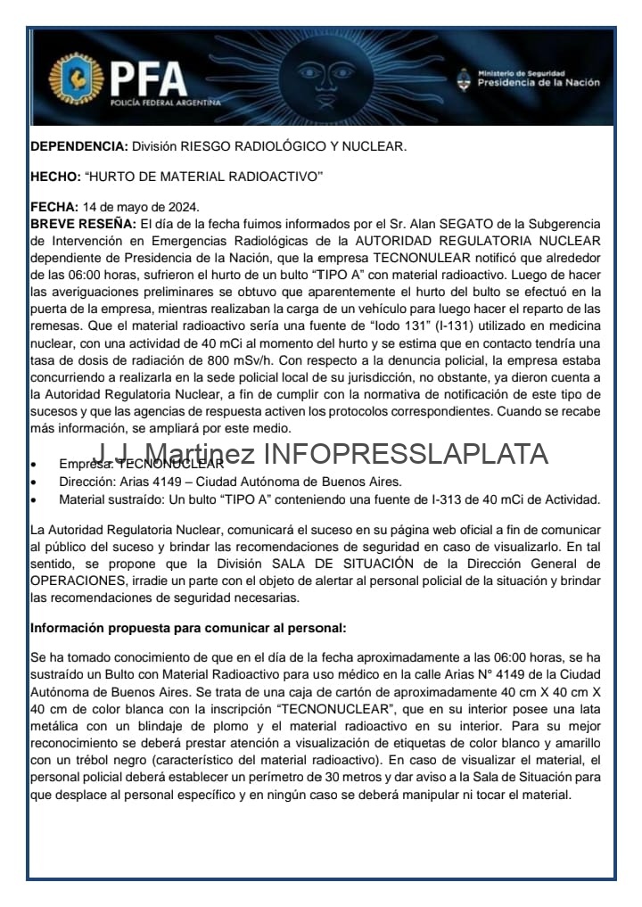 A las 17 hs. se hizo presente personal de la División Riesgo Radiológico y Nuclear de la Policía Federal Argentina quien tomó conocimiento por medio del Ente Regulador Nuclear quien manifestó que el material sustraído es una cápsula de plomo que en su interior tiene un envase con 45 mm de líquido radioactivo.