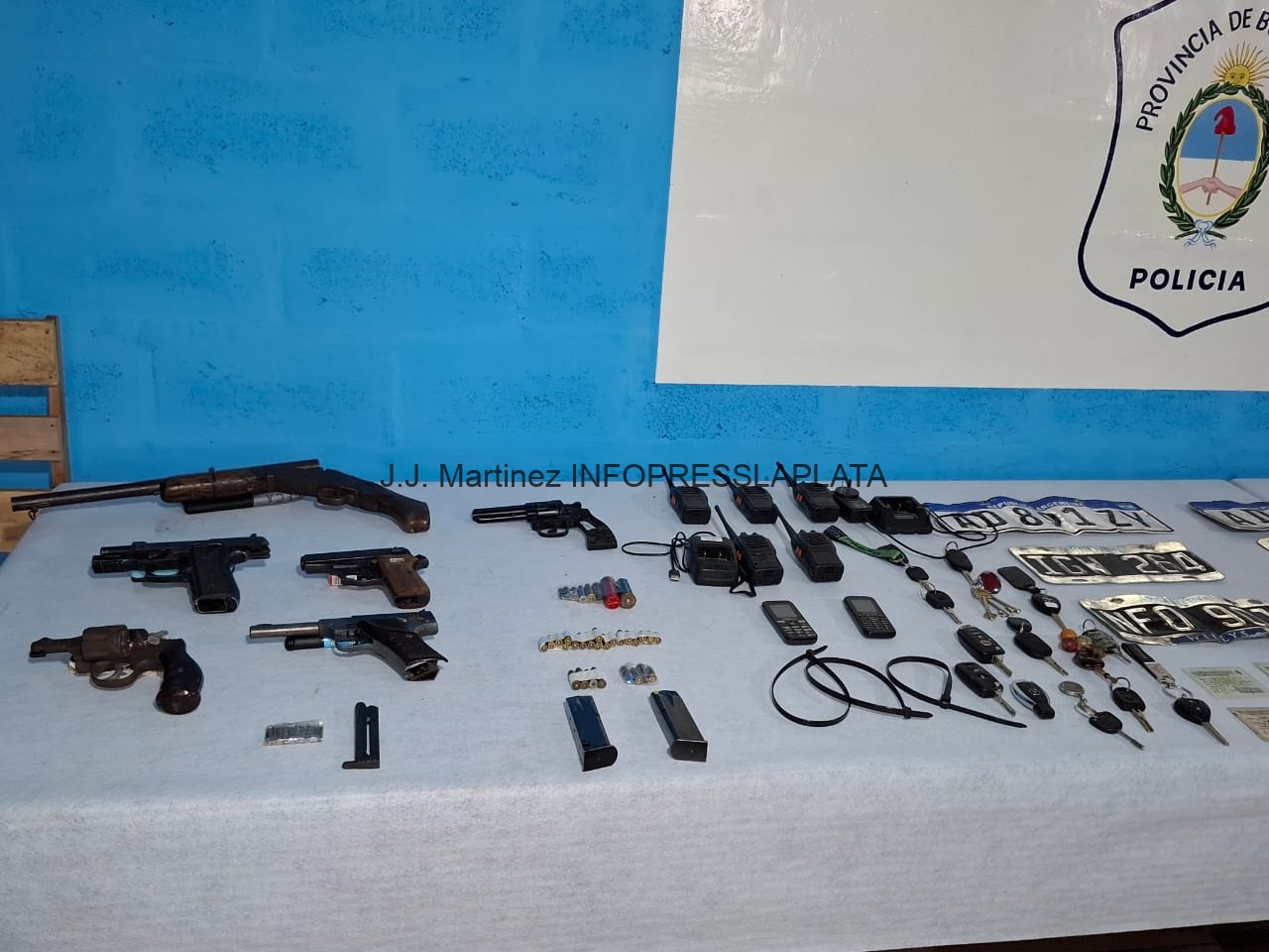 SECUESTRARON 04 Vehiculos con PEDIDO de SECUESTRO ACTIVO, 06 armas de fuegos ( revolver calibre 38, 2 pistolas calibre 9mm una de ellas con PEDIDO DE SECUESTRO ACTIVO, un pistolón calibre 16 sin marca, pistola calibre 22 largo, pistola Bersa calibre 380 ), tres chalecos antibalas de esta policía, cinco HANDYS, varias prendas de vestir con la inscripción policía, brechas, elementos de corte, precintos, balizas, tres juegos de chapa patente, quince juegos de llaves de autos, documentación de varios rodados.-
