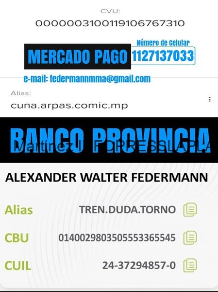 Les dejo un "CVU" de Mercado pago y un "CBU" del Banco provincia si quisieran colaborar.