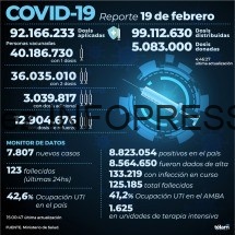 Otras 123 personas murieron y 7.807 fueron reportadas con coronavirus en las últimas 24 horas en la Argentina, con lo que suman 125.185 los fallecidos registrados oficialmente a nivel nacional y 8.823.054 los contagiados desde el inicio de la pandemia, informó hoy el Ministerio de Salud.