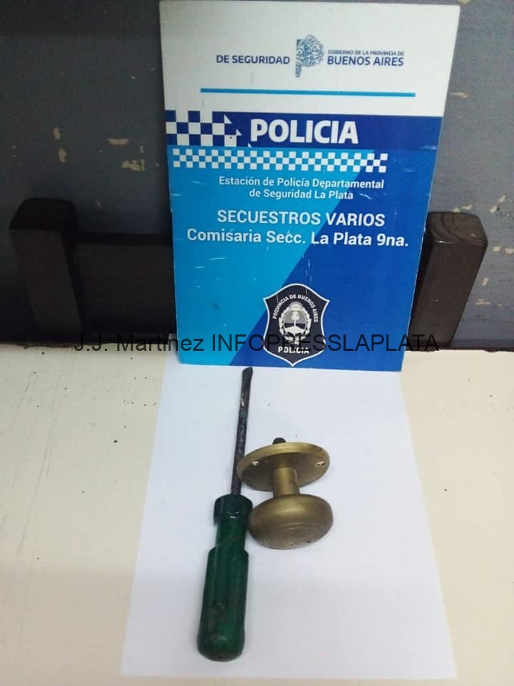 Al llegar los móviles del Comando Patrulla La Plata, los efectivos divisaron al acusado dentro del edificio con un destornillador y un picaporte de bronce.